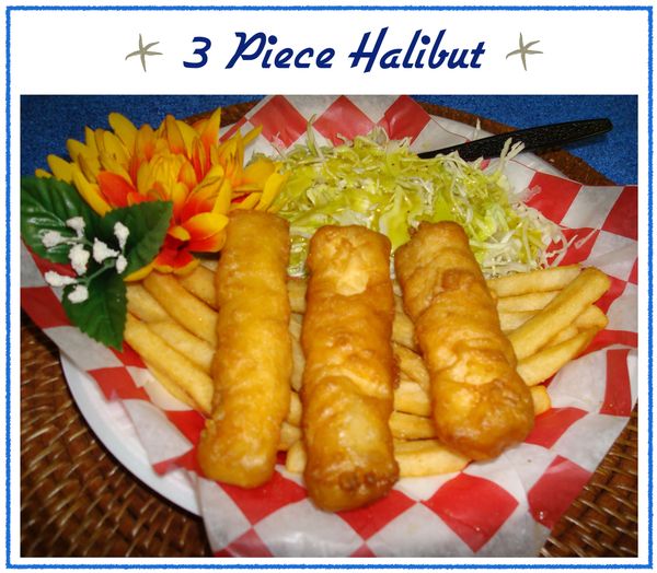 3 piece deep fried halibut served with golden steak fries and your choice of coleslaw or salad.