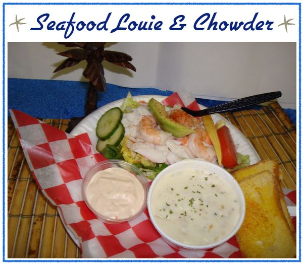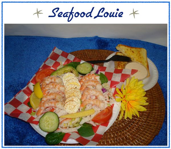 Shrimp, Imitation Crab, Avocado, Beet, Cucumber, Tomato on a bed of greens. Served with Louie dressing and parmesan garlic toast.